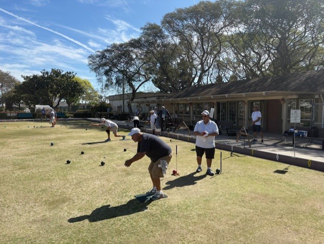 Eight teams of hardy men showed up on an early sunny Monday morning to compete in a pairs showdown. The three bowl format moved quickly and soon the winners were determined. Only one point separated the first and second place contenders! A great day.