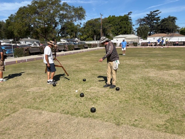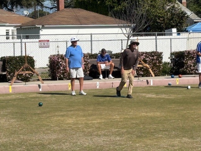 There were 18 entries in this tournament, and they came from Cambria, Oxnard, MacKenzie Lawn Bowls Club, Santa Barbara Lawn Bowls Club, and Friendly Valley. Two games were played before lunch and two after lunch, and I can personally say that four games in one day is a lot. Scott Roberts did a fantastic job of keeping track of the scorecards and ran a smooth ship. When the final results were in, Scott said the scores were the closest he had ever seen in this tournament. Teams from Oxnard came in FIRST, Bob Williams with Jack Bucey, and SECOND, Art Roberts with Tim Adkins because they won all four of their games. Michael Stein and Linda Love came in third with 3 wins and a loss, and the team from Cambria came in fourth with 3 wins and a loss.