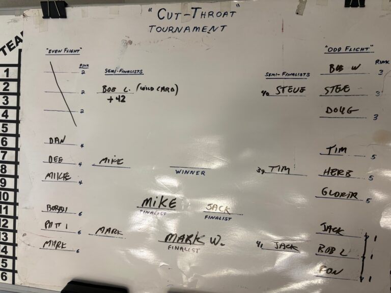 After 4 ten end games Jack Bucey was undefeated for First Place followed by Second Place- Steve Goodmanson, Third Place- Brian Fenton and Fourth Place for Ken Paddock.